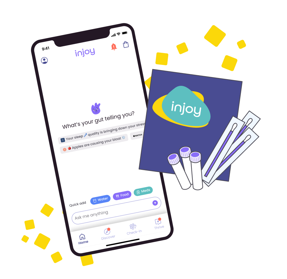 At Injoy, we combine cutting-edge AI and microbiome science to transform how people understand their bodies. Our advanced microbiome test is the only one that tracks changes over time, providing a comprehensive picture of your gut health through 20+ key biomarkers, while our innovative tracking tools make understanding your body's signals effortless.